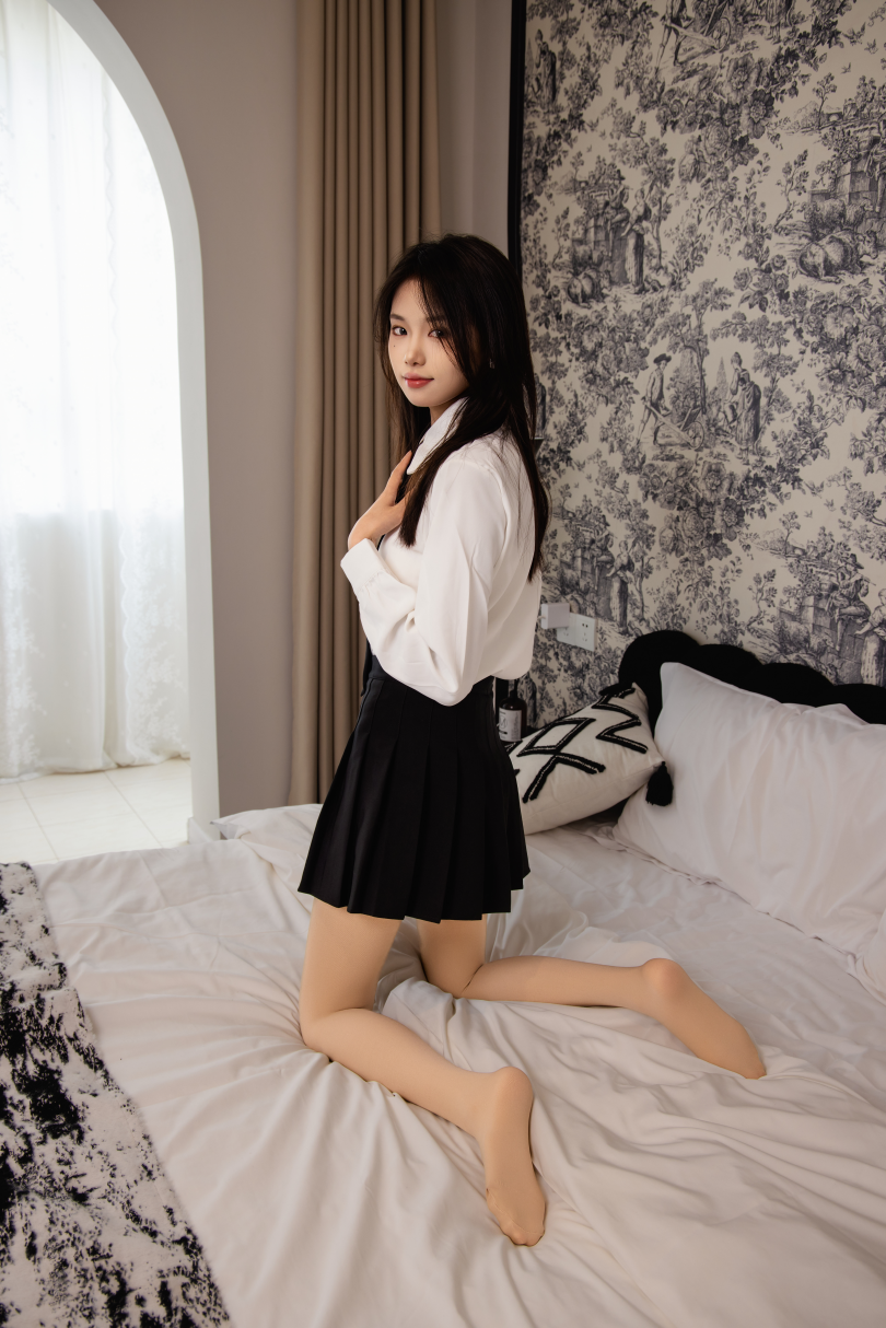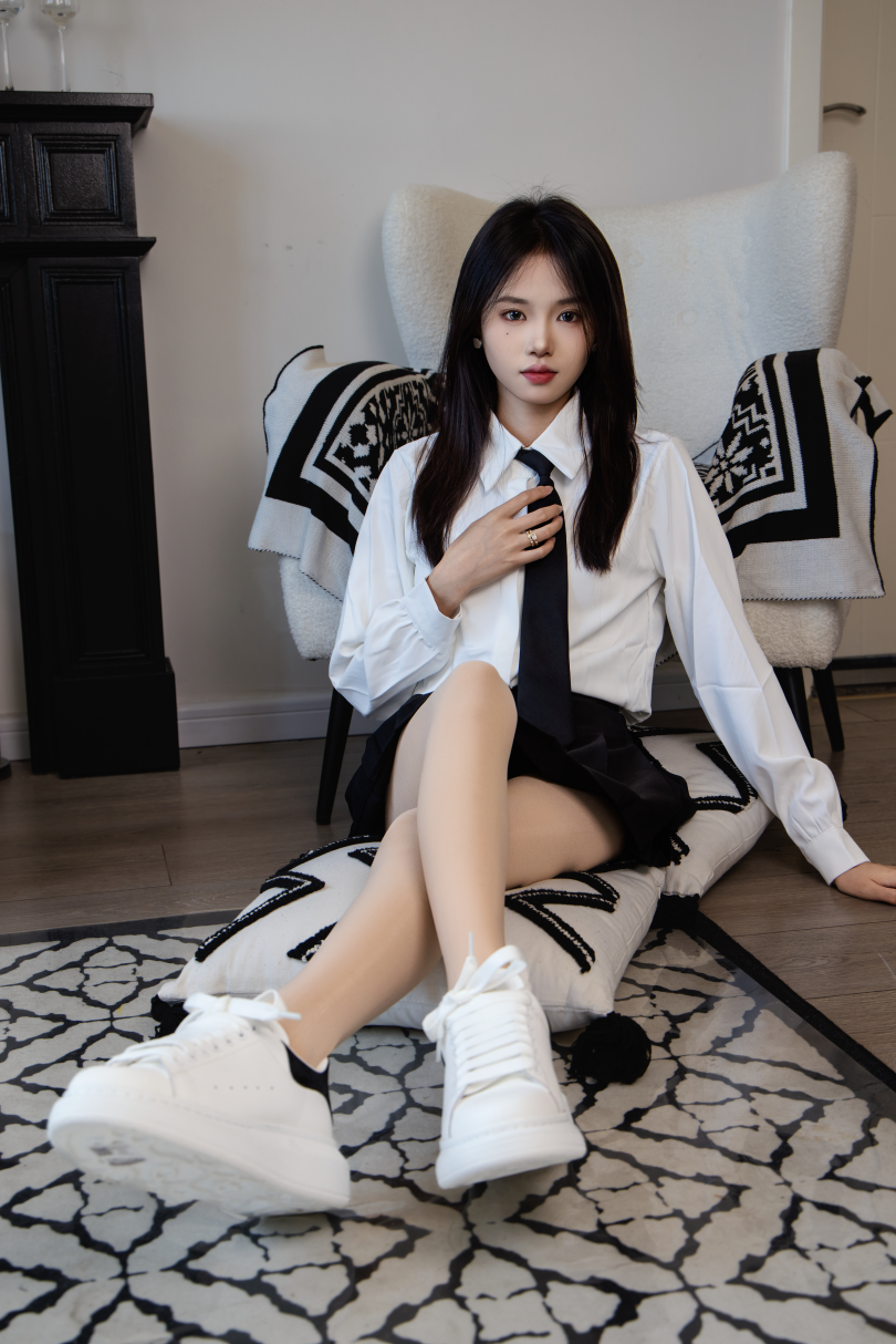 足愉心摄影第68期:模特楚然(搭配:白色衬衫、黑色百褶裙、白色高跟鞋、麦昆鞋、肉色丝袜)