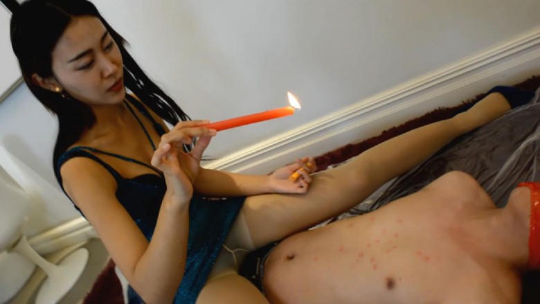 奴隶得有足够的奴性、对女王足够的崇拜,任由女王封着嘴,拿着蜡烛在身上不断滴落。即使被女王夹紧脖子腿绞,呼吸困难,也得承受着痛苦。