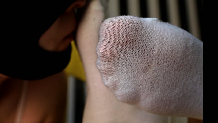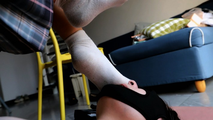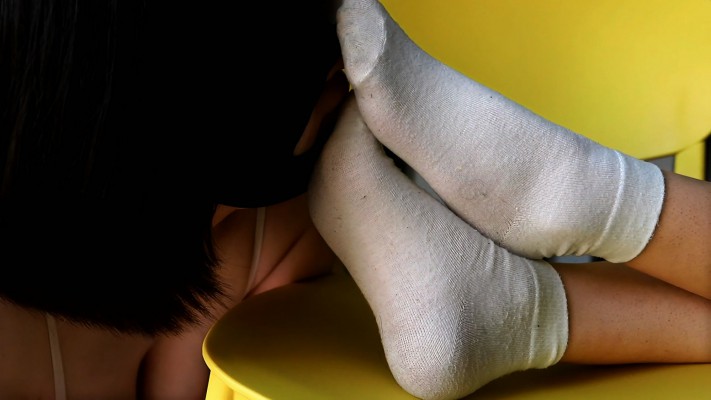 内容:Baby有两个爱好,喝酒和蹦迪。于是乎找了个酒吧卖酒的兼职,谁也拦不住,不给工资也要去。每天半夜开业就去,客人点的酒基本都被她喝了,喝高了就下去摇。这些天一直穿这双白袜子,大概得有45天,当然没洗过,这货从来也没洗过袜子。袜子说不上太脏,但是汗没少吸。头天晚上蹦了一夜,这袜子穿的又臭又咸,体香味基本没了,人家别的小姑娘袜子穿久了都奶臭奶臭的,她就一股咸鱼味,就算这母狗也受不了啊,闻了都上头,脑袋疼。上次母狗舔她白丝,舔多了舌头麻了。这次舔完这双袜子,齁嗓子了,咳嗽一天。过程中Baby还抓着头发把脚往母狗嘴里捅,母狗早就头晕目眩了,到最后,没结尾,本来要拍很久的,也就拍到一半母狗感觉自己要中毒了死活也不拍了,所以就烂尾了。本来后半段要拍裸足插狗嘴的没拍上,母狗吓得瑟瑟发抖,就算了没拍。